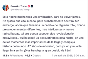 Fue en su cuenta de Truth Social que el mandatario estadounidense lanzó la dura amenaza. «Toda una civilización morirá esta noche, para no volver jamás. No quiero que eso suceda, pero probablemente ocurrirá».