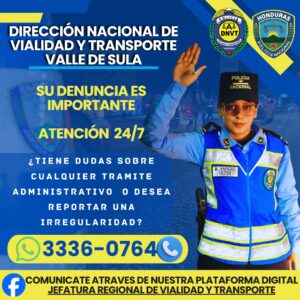 En su defecto también comunicarse a través de nuestras plataformas de Facebook Policía Nacional Región Valle de Sula y Jefatura Regional de Vialidad y Transporte o al número: 3336 0764.