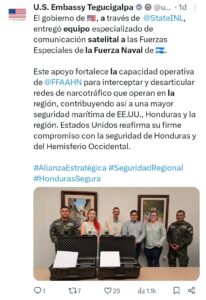 Estados Unidos entregó equipo especializado de comunicación satelital a la Fuerza Naval de Honduras, con el objetivo de fortalecer la intercepción y desarticulación de redes de narcotráfico que operan en la región centroamericana.