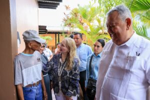 Lissette del Cid de Asfura, comparte un momento de cercanía y afecto con una adulta mayor.
